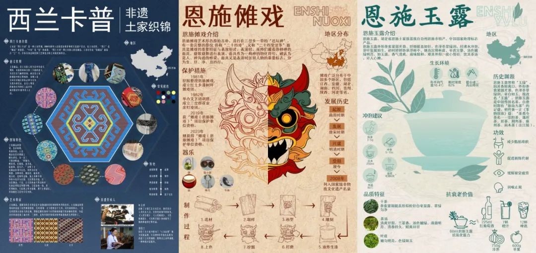 通过十余场深度访谈,团队与非遗传承人倾心对话,汲取守护文化的智慧力量。基于田野调研,他们创新设计非遗可视化海报,匠心拍摄纪录片与短视频,以青年视角为恩施非遗注入新时代生命力。