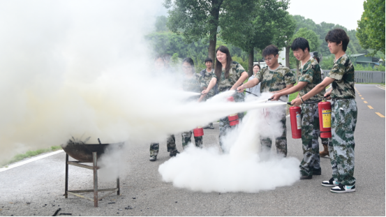 理论讲解后,课程进入实操环节。扈教官详细演示了灭火器的使用方法,并总结出“拔、握、站、压”的四字口诀。新生们在教官的指导下分组进行实操练习,通过模拟灭火操作,将理论知识转化为实际技能,显著提升了安全急救能力。