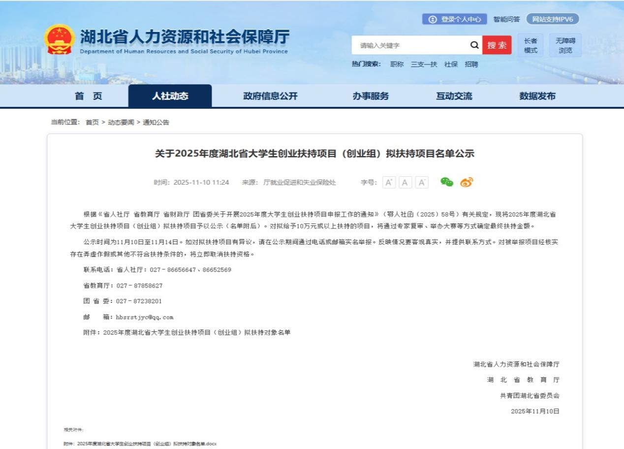 据了解,湖北省大学生创业扶持项目由省人社厅联合省教育厅、省财政厅、团省委共同组织实施,是湖北省推动高校毕业生高质量就业和自主创业的重要举措之一。项目每年上半年启动申报,经过严格的材料审核、实地考察与专家评审等多轮遴选,最终确定扶持名单,旨在为大学生搭建从创意萌芽到社会实战的孵化平台,助力青年学子实现创业梦想。