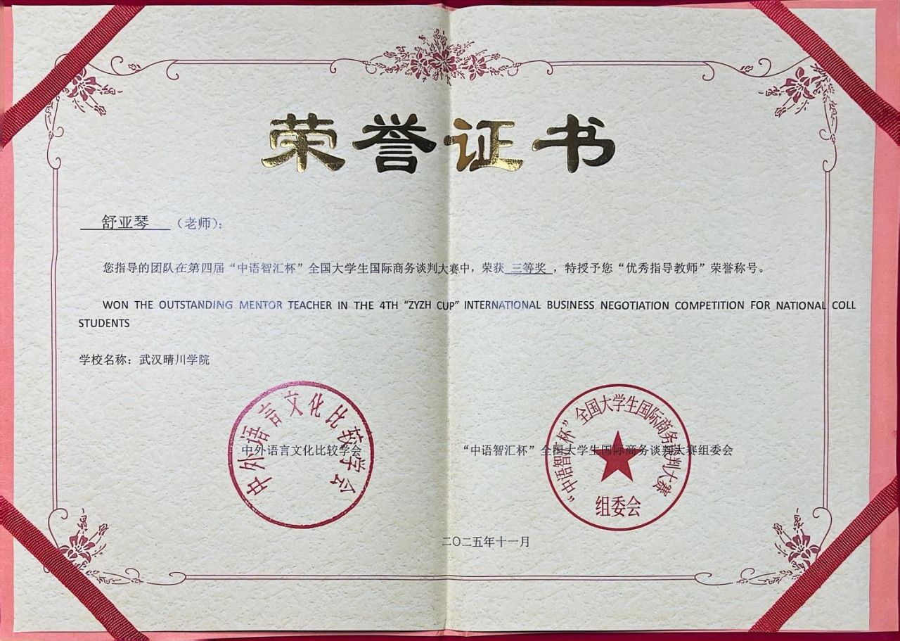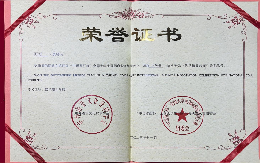 (通讯员:柯可 编辑:刘小丹)近日,在第四届“中语智汇杯”全国大学生国际商务谈判大赛全国总决赛中,武汉晴川学院外国语学院与来自全国高校的143支晋级队伍同台竞技,团队(成员:王德琳、周欢、刘畅、陈盈盈)在柯可、舒亚琴两位教师的指导下,凭借扎实的功底、稳定的发挥与出色的团队协作,最终荣获全国三等奖。柯可、舒亚琴老师获评“优秀指导教师”,柯可老师还应邀担任了本届大赛全国总决赛的评委。