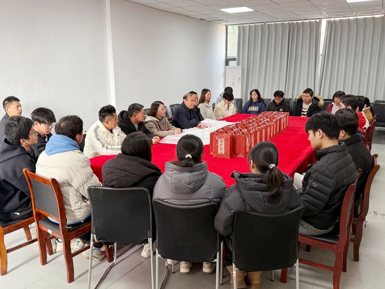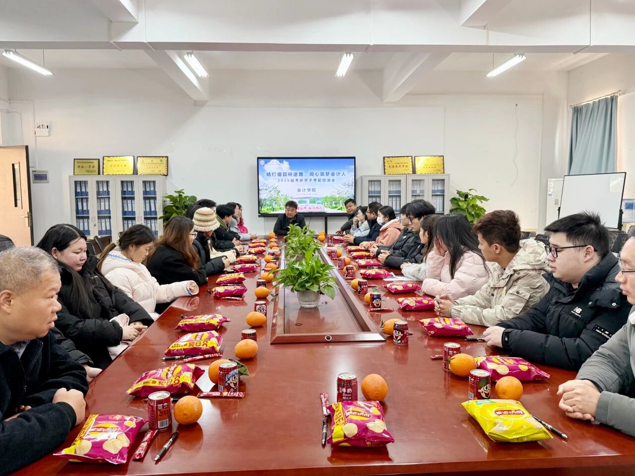 12月18日,会计学院为考研学子精心举办加油会。学院准备的暖心礼包寓意深远:“六六大顺”的旺仔牛奶、“好事翻倍”的番茄薯片、“事事如意”的柿饼与“心想事成”的橙子,每一件都承载着真挚的期盼。院领导、教师与学子亲切交流,从心态调整到复试准备,从作息饮食到答题技巧,细致叮咛,暖意融融,为即将踏上考场的学子注入坚定信心。